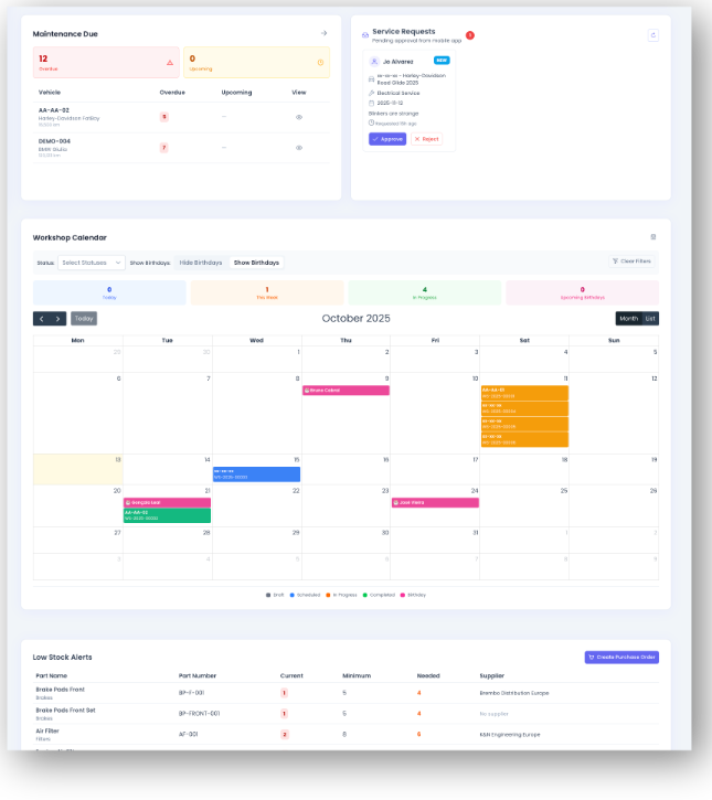 Complete parts catalog management with supplier pricing, stock tracking, and purchase order integration. Monitor low stock alerts and automated reordering suggestions.